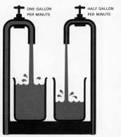 Andre Marie Ampere, who has been called the Newton of electricity, wsa the first to describe current as the flow of electricity along a wire. This flow is analogous to the surge of water through a pipe. The diagram shows two pipes, one twice the width of the other: in a given time, twice as much water comes from the wider pipe. Just as the rate of water flow is measured in gallons-per-second, current is measured in coulombs-per-second, a coulomb being a unit of electrical quantity.