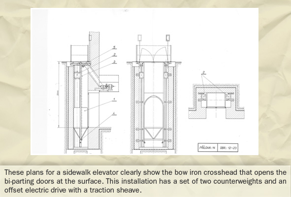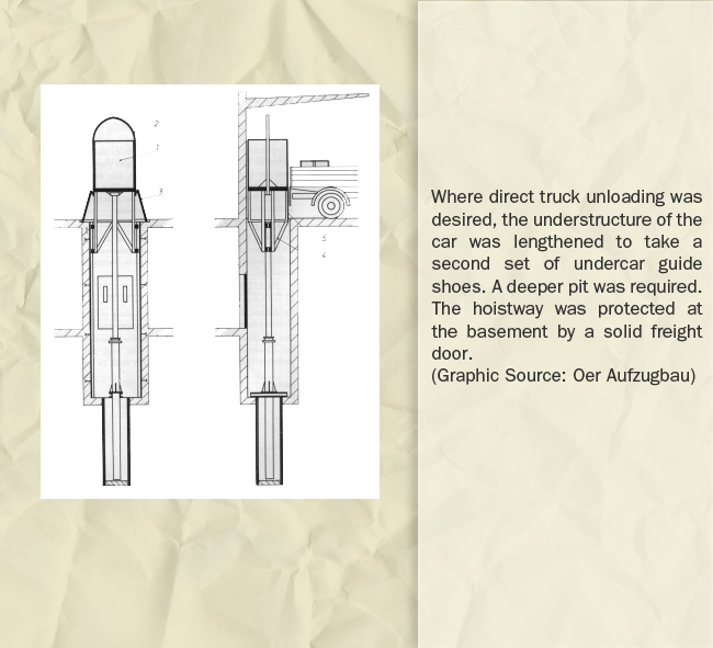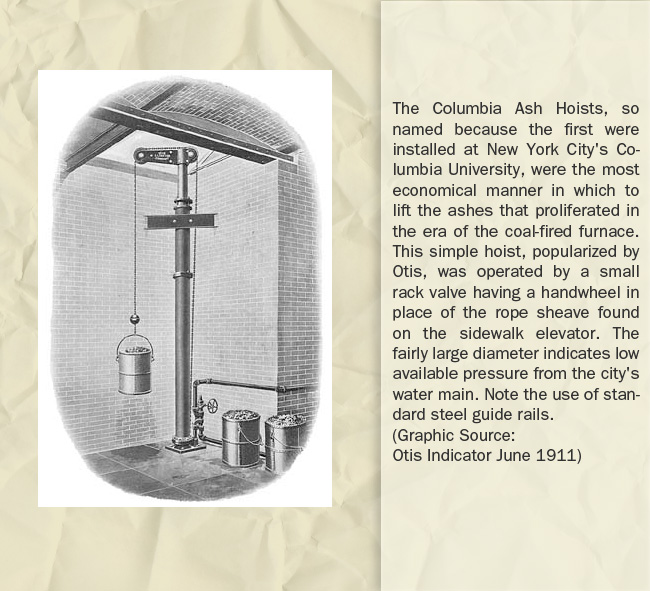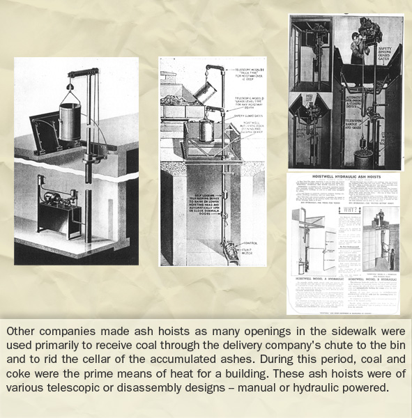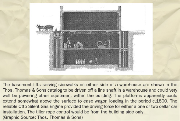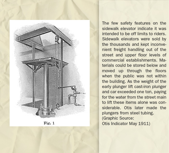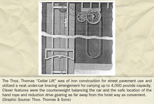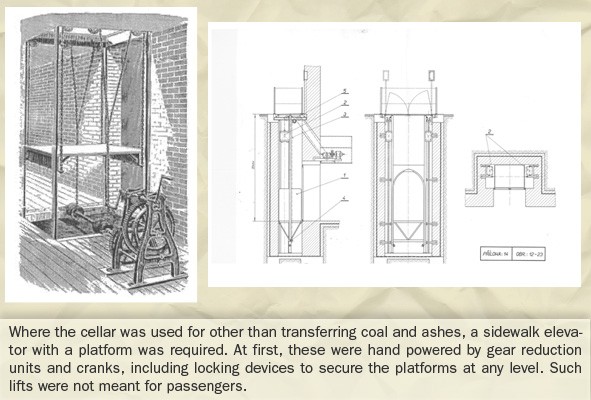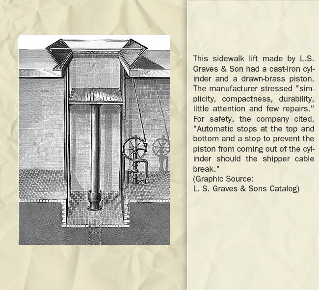 Why the proliferation of short-travel lifts in early commercial history? It was probably more economical to dig out a basement than erect an upper floor. Then, too, the basement became the machine room for the building. It houses the furnace and the coal as well as the residue ashes. If the building was multistory and required a stem of hydraulic elevator, it was still handy to have a lift between the cellar and the sidewalk. Manufacturer catalogs indicate that sidewalk elevators were big business in the early days of elevatoring. A basement kept unsightly necessities out of the customers' sight and a firm foundation for such machinery as the building required. It was a cool place to store kegs of beer and other perishables in times that knew little of refrigeration. No substitute existed for the sidewalk lift that took merchandise or bulk materials directly to their storerooms. When the floor of the sidewalk lift could be raised to the level of the truck bed, that was the "frosting on the cake"!