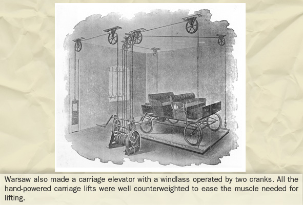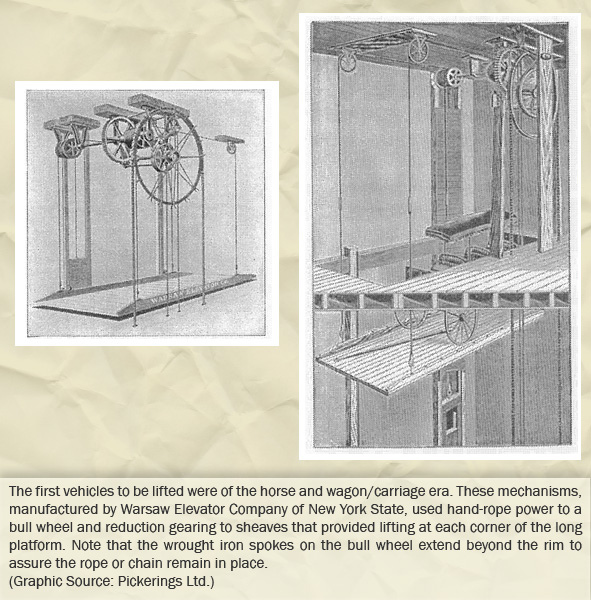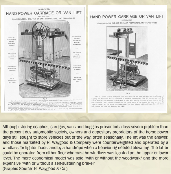 Rail and train travel competed on land, century after century, through all power eras. However, even the heaviest rail cars had to be lifted for maintenance by hydraulic power. Automobiles were also raised for maintenance, but by far the greatest problem associated with cars was their overabundance in urban centers. Storage schemes proliferated to alleviate serious congestion problems.
