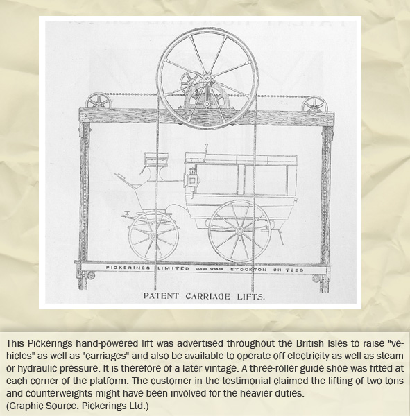 As various eras of transportation gained prominence, the lifting industry and its machines provided support systems. Water was the first medium of transport whether small craft on the rivers of the Middle and Far East, or ships upon the Mediterranean and Indian Seas. Naturally, the hoisting of sails made travelling long distances easier and oars were the levers of motion. Where no waterways existed, they had to be introduced in the way of canals. Lifting machines dug the canals, but once water flowed within, craft could not be moved uphill! Solving the elevation of barges and other canal craft brought some of the industry's most innovative lifting -- the shiplifts -- and, not to be forgotten -- drydocks that lifted ships completely out of the water! As luxury ships housed hundreds, even thousands of passengers, they became mini-cities requiring transportation between levels. Rail and train travel competed on land, century after century, through all power eras. However, even the heaviest rail cars had to be lifted for maintenance by hydraulic power. Automobiles were also raised for maintenance, but by far the greatest problem associated with cars was their overabundance in urban centers. Storage schemes proliferated to alleviate serious congestion problems. As will be seen in other galleries, -- Escalators and Moving Sidewalks -- during the era of air travel, as aircraft became larger, they had to be dispersed in more widely separated areas for embarkation. This necessitated the continuous movement of people between planes and land transport. Escalators, moving sidewalks and shuttles helped alleviate this problem.