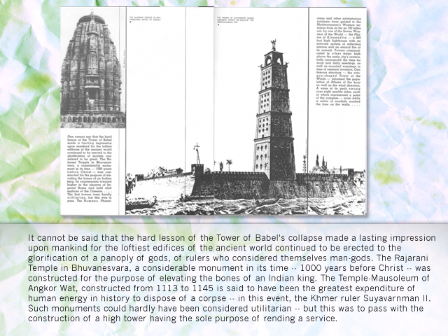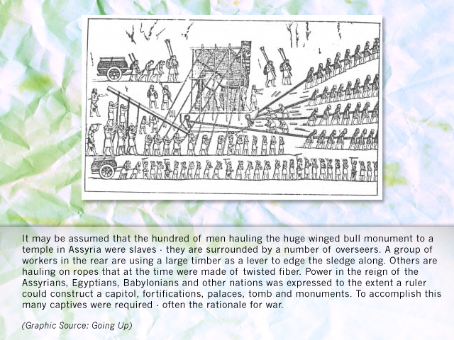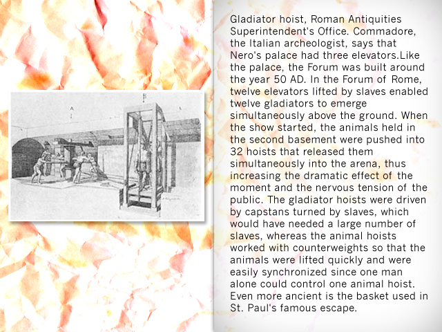 "Culture" -- a means by which a way of life is transmitted from one generation to another by language or symbols -- was tedious before the alphabet, sketching and the creation of symbols were codified and literally, "cast in concrete." Lifting had its place of importance in the understanding of past cultures for the great monuments left behind through centuries could not have been created without an ever-greater understanding and application of the elevating science. At first, the monuments were basic, stressing height and massiveness -- a Tower of Babel, ziggurat or pyramid. Elevating was required no less as artistic skills developed and great pieces of statuary had to be hoisted. With the coming of leisure time, and the penchant of the aristocracy to placate the mass of citizenry, huge amphitheaters were built and lifting became central to the entertainment. Artistic expression for the elite also made use of lifting devices, adding elegance and surprise to the presentation. When religion became the primary means by which culture was passed down through generations, the emphasis was upon building large churches and cathedrals the higher the rank of the sponsor -- royalty or bishop -- the more magnificent the latter structure and greater the need for years of elevating materials."
