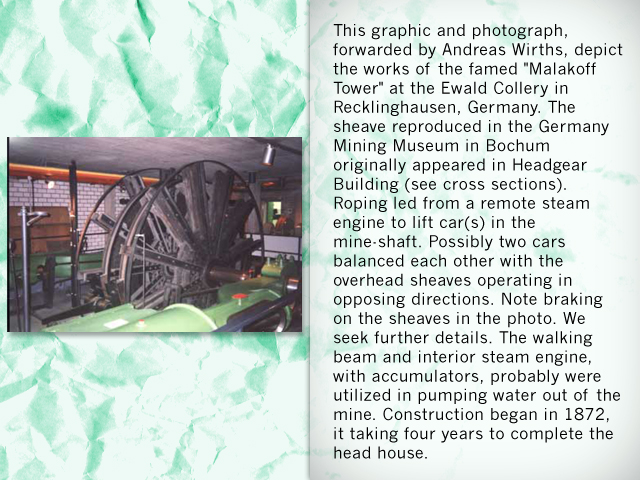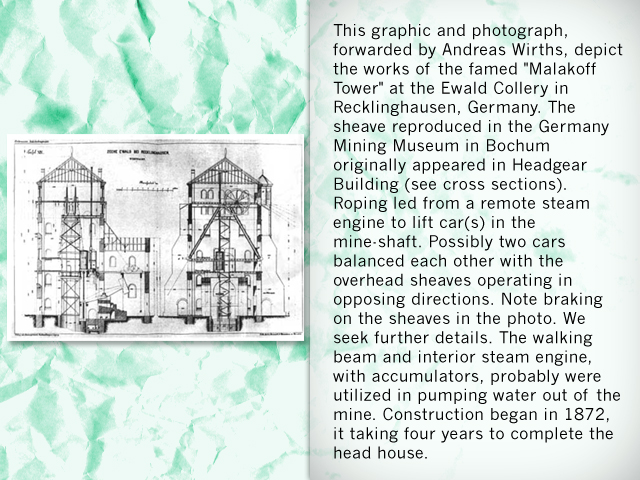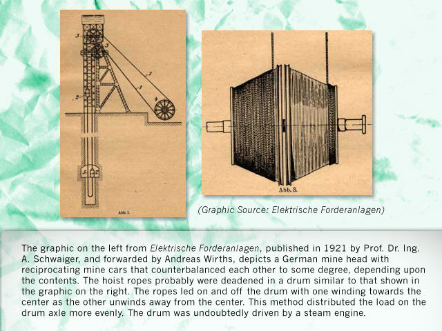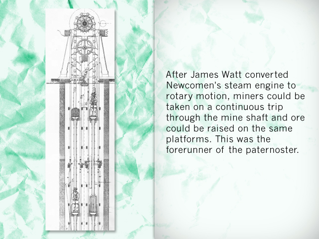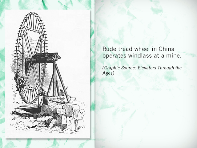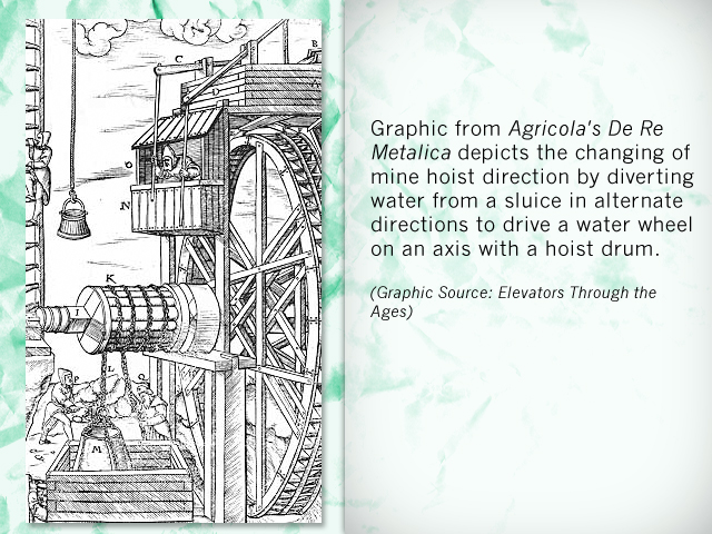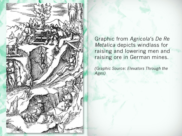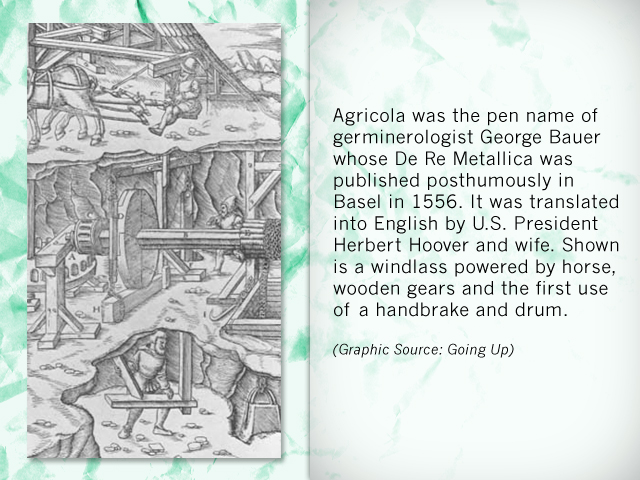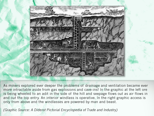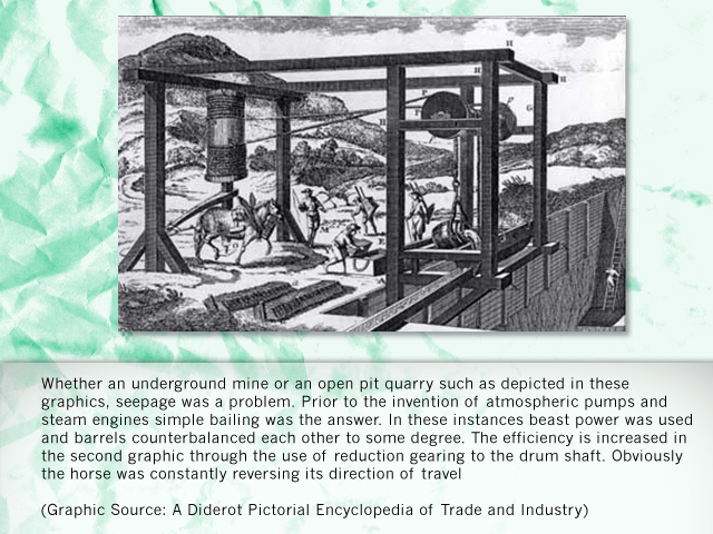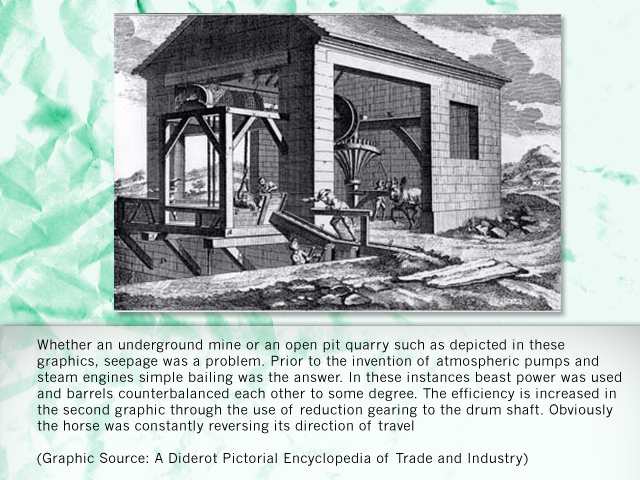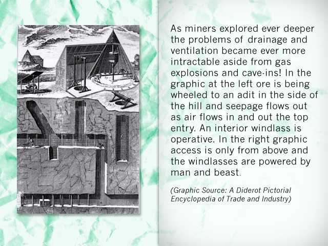 Little, if any, valuable ore was found in the river valleys supporting systematic agriculture. On the other hand, those living in the highlands had learned to work shallow pits for copper and gold, two soft minerals that could be worked into jewelry and other items of limited utility. When tin was found and mixed with copper, an amalgam was developed giving its name to a lengthy Bronze Age, a technological period when men first made tools and weapons from metal. Casting was well established in the Middle East in 3500 B.C. Probably that era's heaviest commerce was between those who raised an excess of food but desired metals, and those unable to raise crops but knowing how to bring other valuables out of the earth. Various mixtures of these malleable metals brought forth fastenings for wooden gears and machines some of which were used for lifting. Iron was also known in the Middle East about 3000 B.C., but did not come into wide use for another 1000 years when it was found that iron ore could be softened with the intense heat created by burning coal and injecting forced air. This combination of coal and iron created metal that could be cast in molds or beat into the hardness required to make the sturdier gearing and machines that would take the heavier pressure of the steam gradually being harnessed. First came an atmospheric device to pump water out of mines, being sunk ever-deeper to find the iron and coal combination that drove the Industrial Revolution in England, then Europe. When the Newcomen reciprocating engine was given rotary motion by James Watts in 1769, men and ore could be more quickly moved between the mine's lower levels and the surface. The emphasis upon lifting water for crops, that had given way to the lifting of earth and stone for ever towering structures, gave way to devices that took men deeper and deeper into the bowels of the earth to harvest minerals more precious than gold!