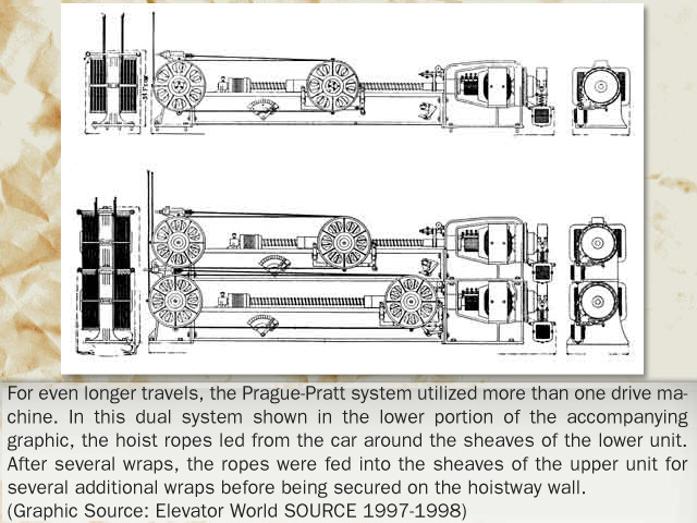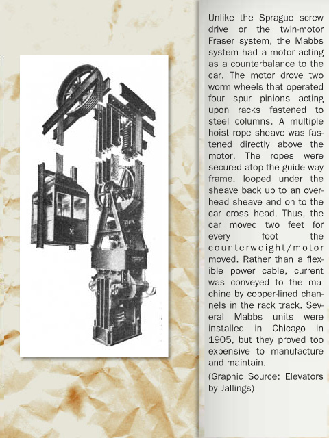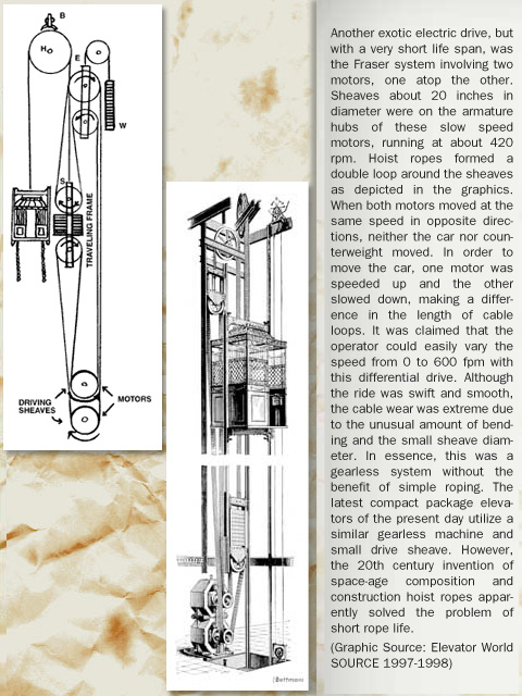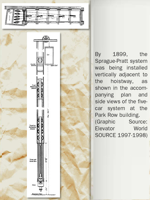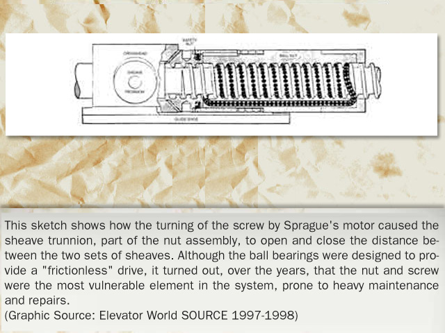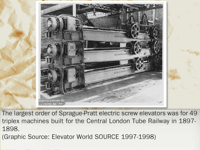 "Electric engineer Frank Julian Sprague is better known for his pioneering development of the first electric street car. Millions of Americans were more interested in moving out of the hot, congested city core than in traveling vertically within a building! However, when Sprague did turn his attention to the elevator field, he perceived the limitation of the electric direct-connected drum machine. The drum could hold insufficient hoist cable to serve the high-rise structures coming into vogue; its shifting lead off the ever widening drum and the inability to balance the load between two wire ropes convinced him that an electrical variation on the roped hydraulic machine provided a more practical solution. In 1988, Sprague and Charles C. Pratt, a mechanical engineer, joined forces to develop a screw drive that maintained a degree of popularity for a decade. Inventors Fraser and Mabbs also opined that better electrical solutions existed than the direct connected gearing between motor and drum. Their solutions quickly drifted in and out of history while Sprague's name entered the annals of valid inventors in the elevating field."
