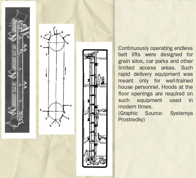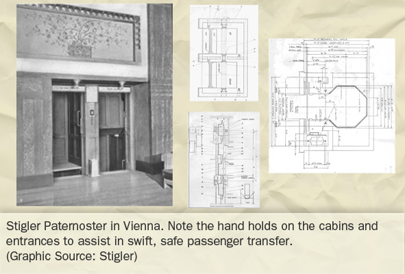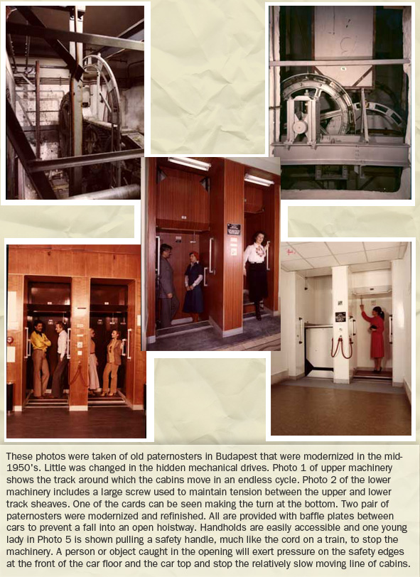 Probably, the reciprocating rods used in the early mines were the first system for moving men both vertically and continuously. A number of miners could be taken up and down a mineshaft at the same time. And when goods and/or passengers were transported in a wagon, it must have been obvious to all that the continuously rotating wheel was a most efficient means of locomotion. It was therefore logical that when the time came to move passengers vertically in a heavily-populated multistory building, thoughts turned to a conveyor belt passing over a wheel and moving passengers continuously. Such a device was invented in England and given the name of "paternoster" or "Our Father." The similarity of the string of cabins to the beads on a prayer rosary was obvious, but potential riders may have considered that the hazard of nimbly transferring called for the saying of a few "Hail Marys" and "Our Fathers." The endless chain of cabins was quickly adopted on the Continent where the Germans vied with the English in adding safety features. When considered on the basis of "people carried per hour," no elevator could approach the efficiency of the paternoster, and the device proved particularly popular in colleges and military schools where young people took such transportation in their stride. Employees were inexpensive in those days, and hotels utilizing the paternosters may have provided assistance to those boarding and alighting. In modern times, elevator control systems requiring a period of familiarization, such as Hall Preregistration of Designated Floor, are most efficient in buildings with a limited number of visitors. It must have been much the same with paternosters; they were most efficient when used by the same passengers over and over again! Endless belt transportation of attendants in present-day parking garages also works well as only a few employees are allowed to ride the continuously moving steps.