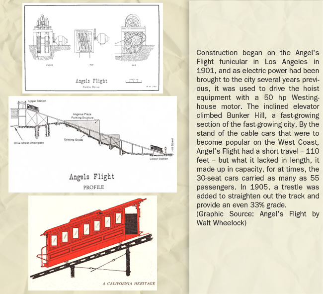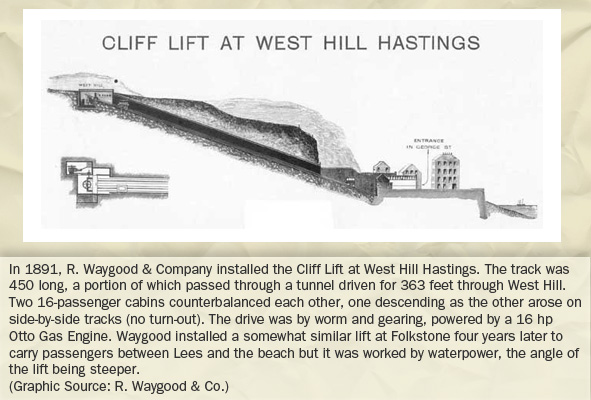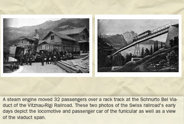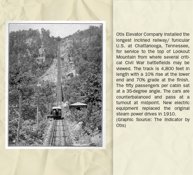 Funiculars (hill-climbers) no doubt came into being before vertical lifts as a method of moving passengers. Obviously, it was much easier to transport a group of people along the side of an existing hill than construct a multistory building. However, the transport of materials came first. Early graphics depict sledges on rollers, then carts with rude wheels, moving building materials and goods. With castles and fortresses finding a natural location on hilltops, it was logical that a form of inclined device was developed to move stone and timber to the construction site. Secure a block with tackle to the cart and the task became easier for human muscle. Add a counterweight and smooth off a track, and a funicular was present -- in practice, if not in name. The laying of wooden, then iron rails on the leveled surface made the job still easier. Records indicate that a water-balance was an early assist -- a tank under the car or the counterweight. Emptying and filling the tank -- as the case might dictate -- would raise the car to the upper level, needed -- either a spring at the top, or a simple water pump at the bottom. In later years, when the times and small payment allowed leisure, the steam-driven funiculars became focal points, taking passengers to high places for a panoramic view. Why not counterweight one car with another? With this technique, the addition of a few more rails allowed a by-pass at mid-point while doubling the carrying capacity. In later years, the aerial ropeway replaced the funicular in many instances. Another Gallery will indicate how passenger ropeways were able to traverse ravines that would have halted funicular construction. When technology advanced to where exciting views could be obtained from an entertainment tower or the top floor of a skyscraper, the funicular gave way to the vertical high-speed elevator. The funiculars had a fine fallback position -- taking skiers to the mountaintop in comfort. The funiculars were also able to rebound in mini form, serving hillside homes. When land for living quarters became scarce, builders looked to the slopes for home sites. Small hill-climbers, with an average capacity of four persons, allowed access.
