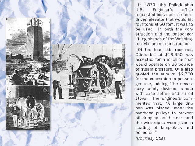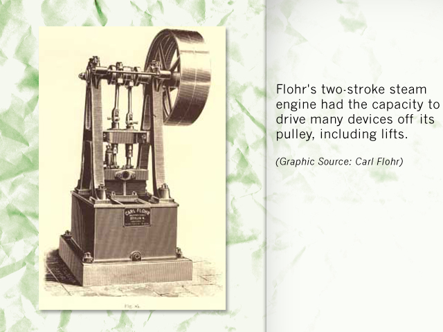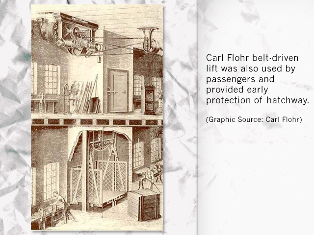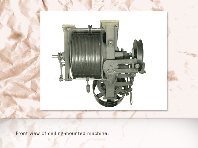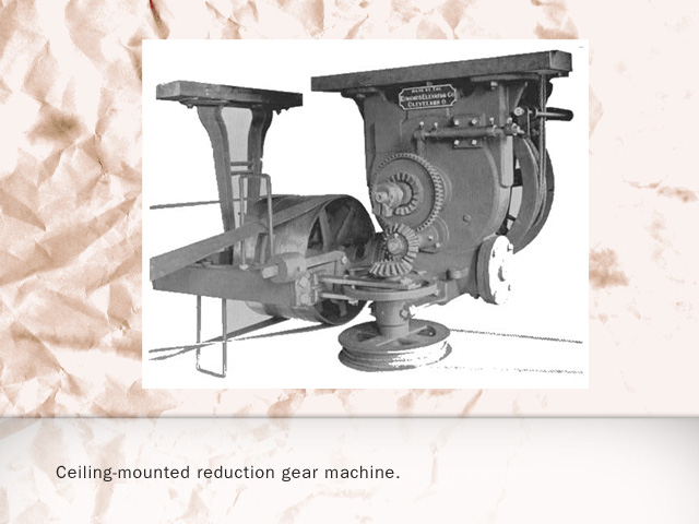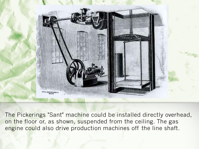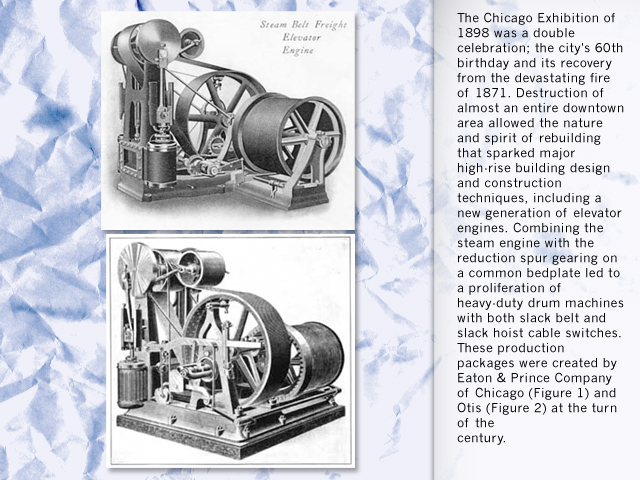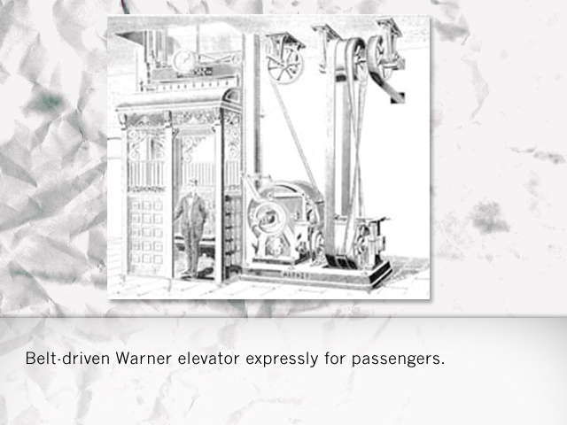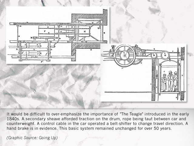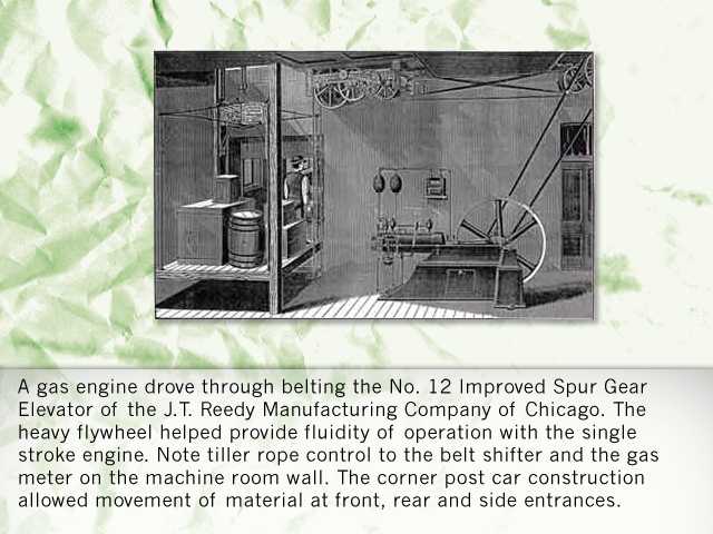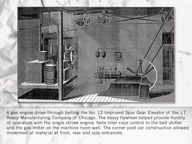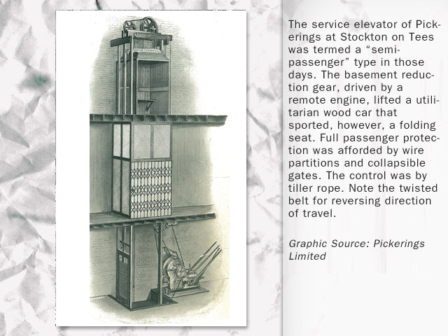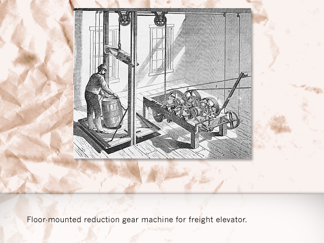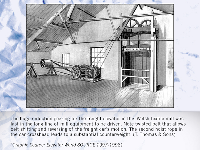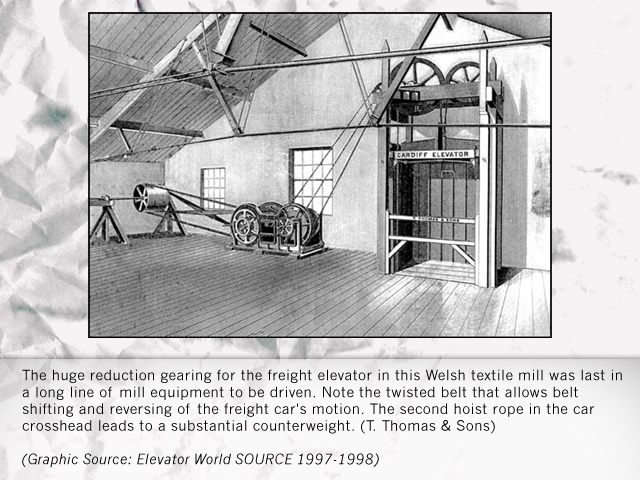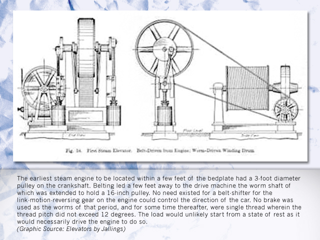 Lifts were appendages to production machinery, on the end of the line-shaft. Life was cheap in the early days of the Industrial Revolution: moving goods -- trade -- was important! It was only later that belts also aided in moving passengers and a modicum of safety was provided. The elevator slowly became useful as a means of moving people. The steam and gas engines moved closer to the point where a passenger elevator had its own power plant. The belts also became shorter, moving ever-closer to the reduction gearing until engineers began to consider making it a part of the machine bedplate. The idea of a "package" elevator machine was beginning to emerge!