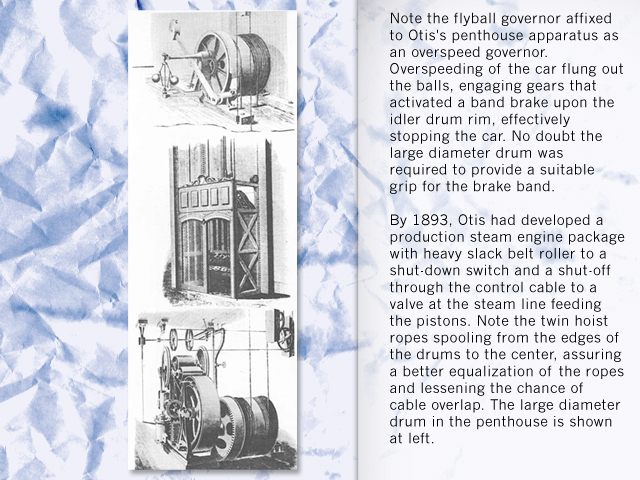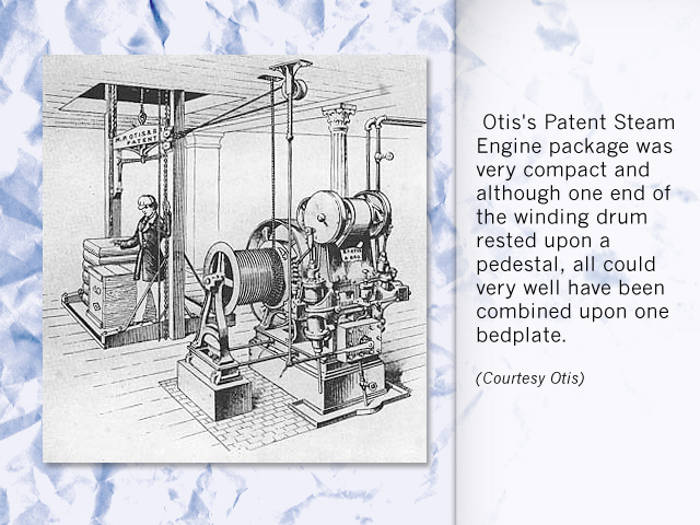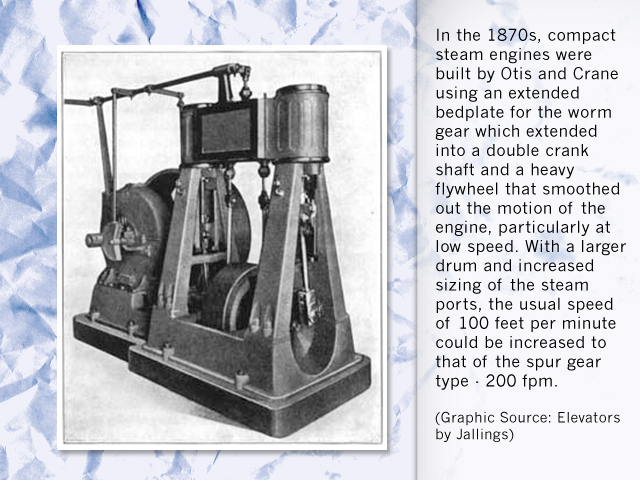 In the mid-1800s, the elevator machine was well on its way to becoming a package! Early in the Steam Power Age, lifts(s) had been the "tail on the dog", at the gar end of line shafts that drove hundreds of mill machines. Gradually, as we have seen, elevators became more important within commercial and private establishments, lifting both freight and passengers and warranting individual steam power plants, or the major use of one. The connecting belts grew ever shorter until steam engines came within sight of the reduction gearing; then next to it within the same machine room. Engineers had the obvious thought; why not mount as much equipment as possible on one bedplate, making the drive machine more utilitarian, economical and space efficient for the manufacturers and owners, as well as more practical for the on-site maintenance man. In this era, scheduled maintenance by an elevator company was not even a gleam in any manufacturer's eye! An important era emerged in which the unification of the power and drive machine took place accompanied by the gradual additional of a few more control and safety devices.