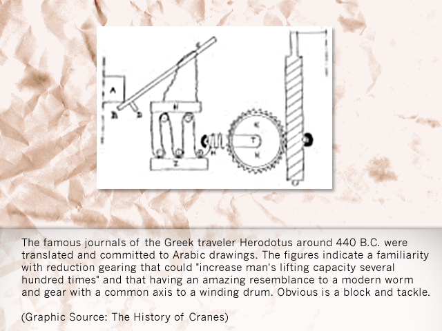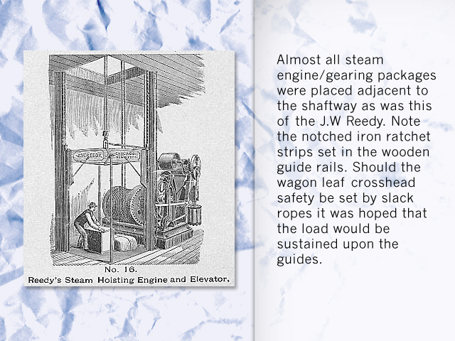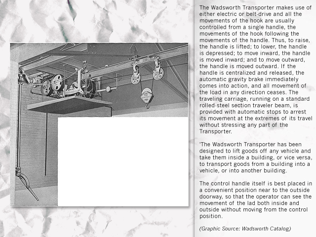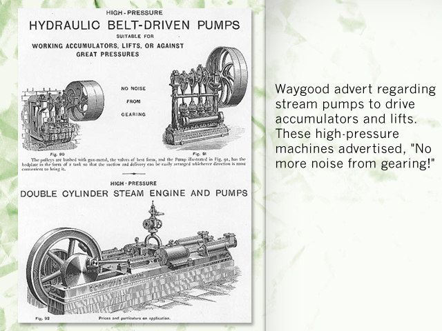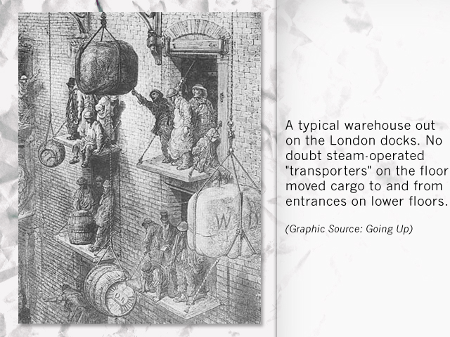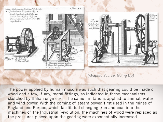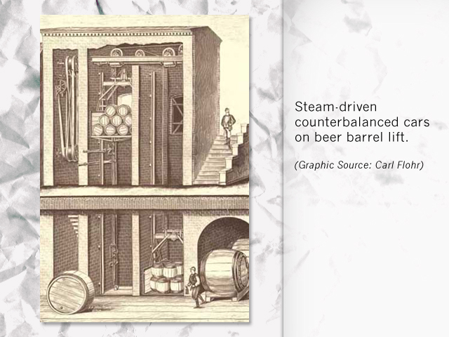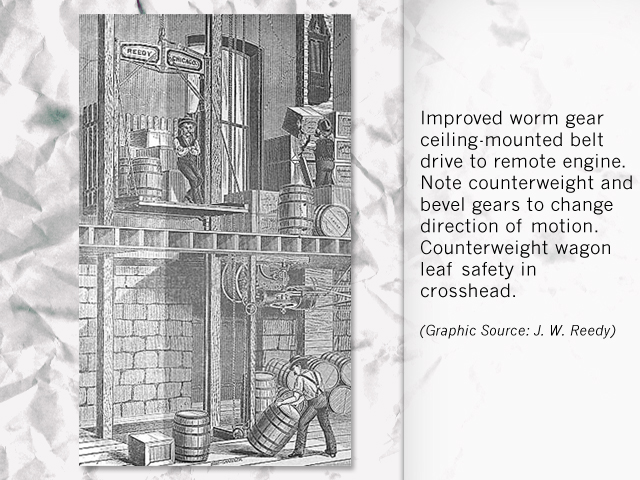 Improvements in engine design and reduction gearing followed their separate paths. The power engineers were concerned with developing an increasing amount of pressure whether in a central plant or on-site; this involved increasing the strokes of the steam, and later the internal combustion engines. In the instance of the central steam plant, they were primarily interested in taking the power to the customer, much as the electric power company does in our day. We have the option of placing a wide variety of appliances on our power line. So it was in the Industrial Revolution, users were on the other side of the equation, developing mechanisms that would use the steam for their particular purposes -- particularly driving various kinds of mill and other factory production equipment. Other engineers developed the reduction gearing that would harness the steam. The gearing for lifting required up-and-down movement rather than the continuous motion of the production machines. The all-important belting that bridged the power and the appliances also assisted in reversing the direction. The belts became shorter and shorter until they, in the instance of lift machines, occupied a common bedplate. With the coming of hydraulic technology, new accessories were developed, including intensifiers, accumulators and counterbalancing, in an effort to efficiently drive and regulate cranes, presses, industrial lifts and elevators.