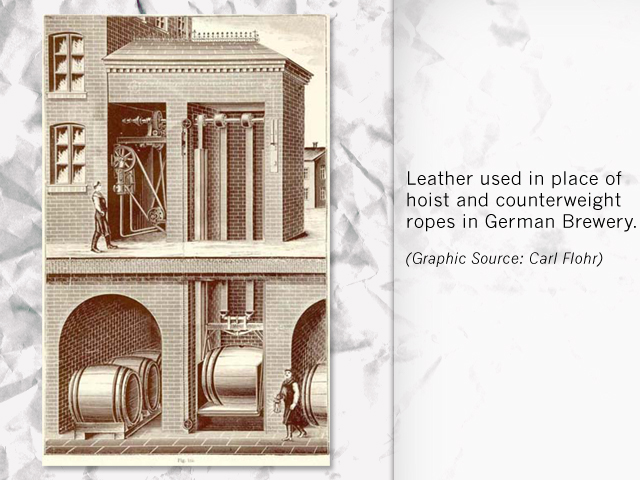 Recognition has always been properly given to those who invented the engines providing the power to drive machines; not so often to those who provided the linkage. "Wire rope" will be given its recognition elsewhere in the museum, but little is known about the evolution of leather belting that for so many decades provided the link between the power source and the production machinery. Numerous unknown tanners and fasteners made minor improvements through the years that brought forth durable belting, the vital means of transmission when direct connection was only a dream of those seeking to improve the speed and safety of lifting.