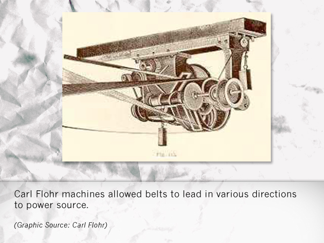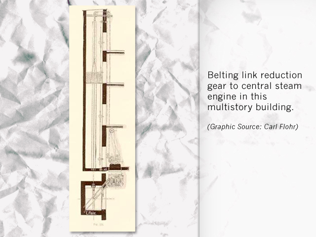 With the direct connection of lifting machines to power source still a distant dream, the simple, lowly leather belt became as important a link in the overall system as the metal ropes supporting the car. Initially, the lift was located far from the main source of steam power in the mill, merely linked, via belt, from the long drive shaft as "one of the machines." As the elevator assumed more importance, the belt between the power source and the reduction drive became shorter and shorter until the individual power source was within eyeshot, then within the same machine room, then next to the bedplate, and finally -- on a common bedplate.